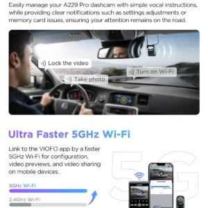 With built-in 5GHz Wi-Fi, the A229 Pro allows you to effortlessly view, transfer, and share footage through the VIOFO mobile app, saving time and enhancing convenience.